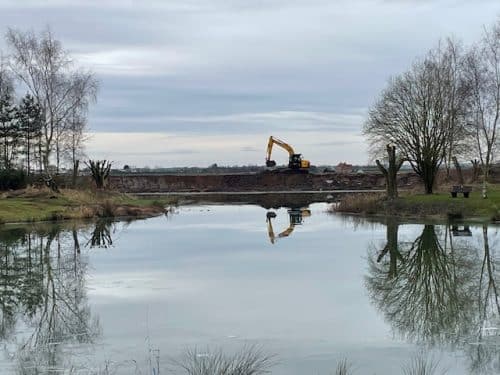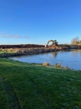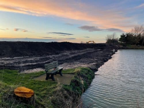 The back bank at the far end of the lake has been re-enforced, protecting the lodge site against the flooding we have experienced on the farm over the past few years. As well as re-enforcing the bank, we have made possible for guests to walk all the way round the lake, and those wishing to fish will now be able to do so from the far end bank. The banks have been seeded with grass and we are looking forward to them greening up, we intend to plant some trees behind the bank to provide more shelter and protection. We also plan to put several perches around the lake to encourage the beautiful kingfishers to do a spot of fishing on the lake too!